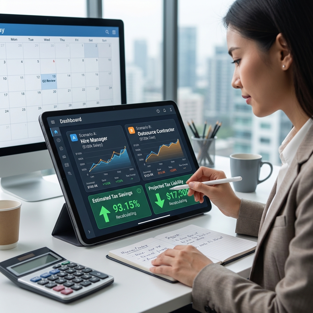 You’re considering hiring a full-time operations manager at $100K salary, or outsourcing to a contractor at $120K total cost. Without tax intelligence, this looks like a $20K expense to outsourcing. With real-time metrics, you see the full picture: hiring adds W-2 wages (which can help you maximize tax credits and self-employment tax planning in an S-Corp), while outsourcing to a contractor doesn’t. If you’re positioned to benefit from a payroll tax credit program or lower the contractor dependency ratio in your business, one path saves you $8K-$15K in taxes compared to the other.